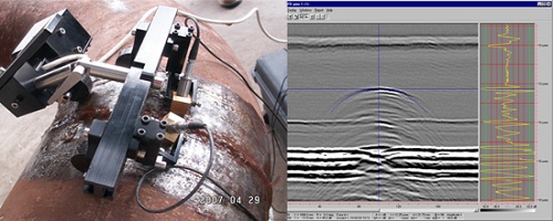 - Probes are mounted on a buggy that travels along a weld, recording data as it moves.